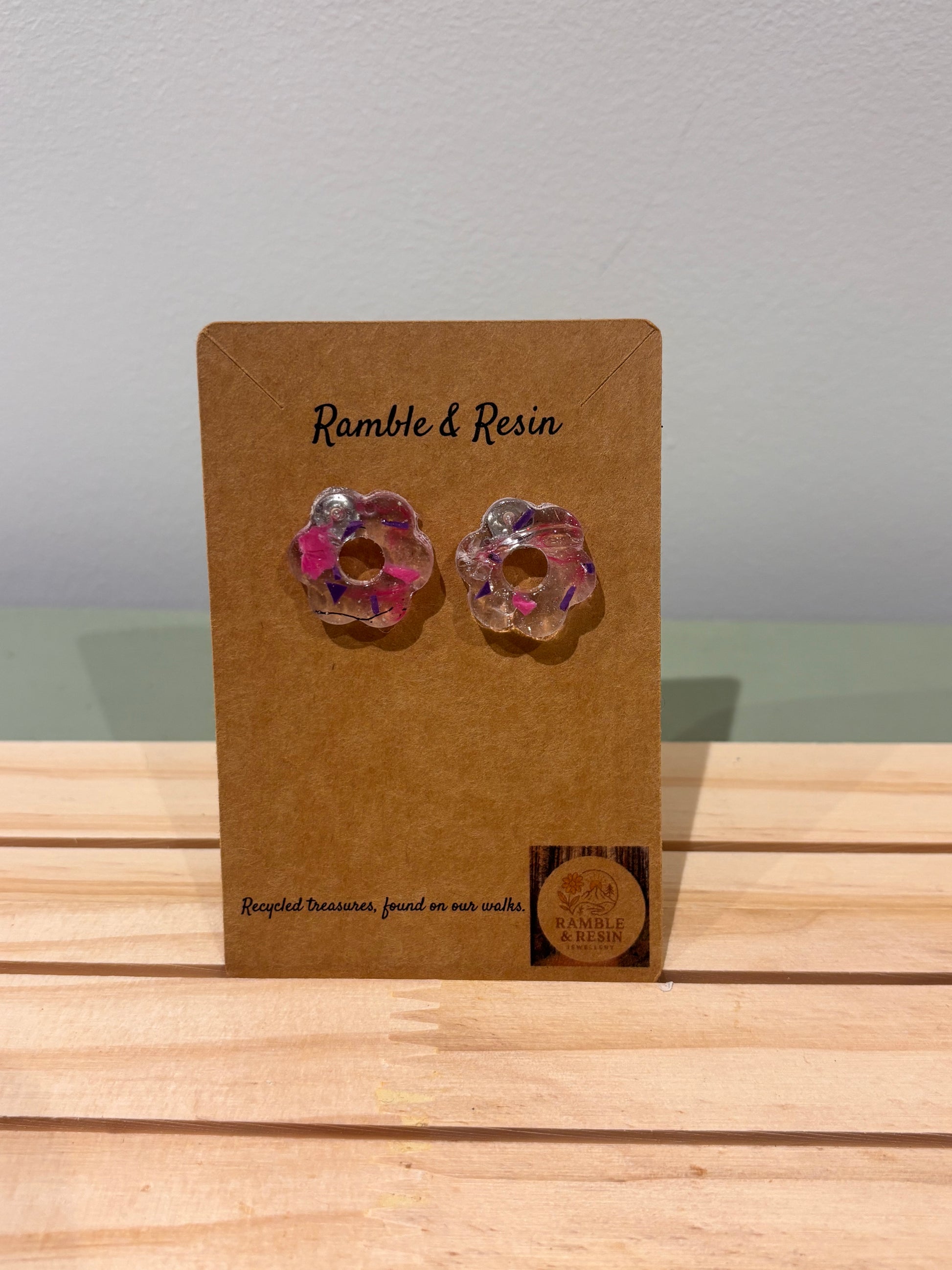 foil, pieces of an elastic band, a plastic bottle top and part of a pink phone charger wire