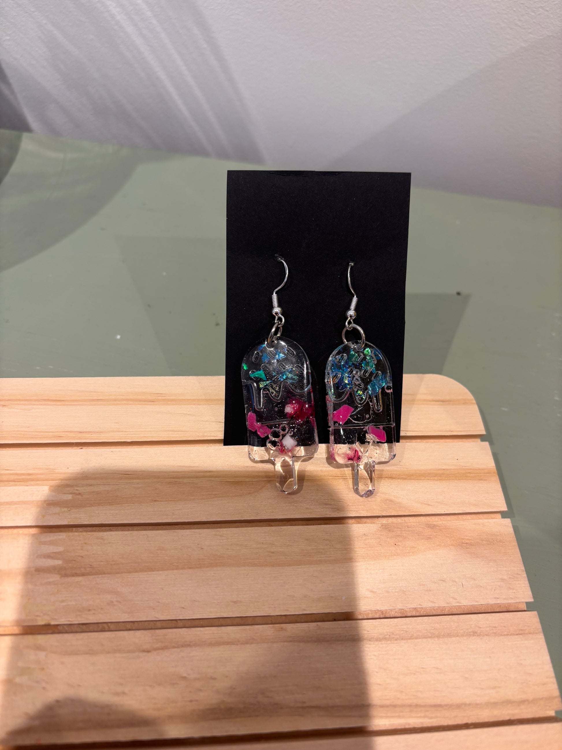 Made with resin and filled with glitter flakes, pieces of a charger and a pink plastic top