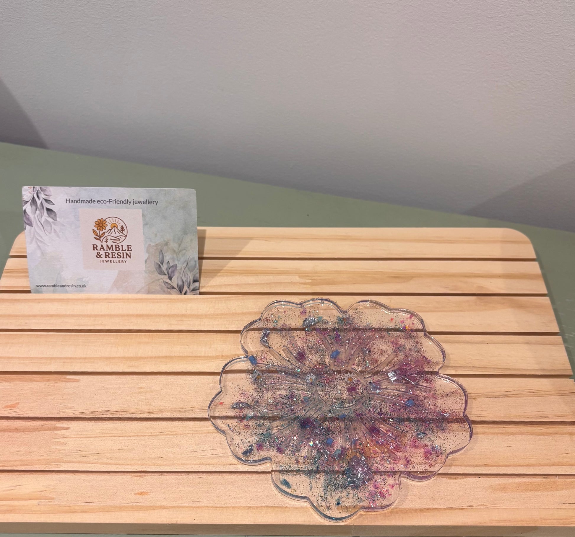Handmade from resin and recycled materials;